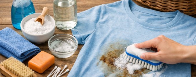 За предмете светлих боја од густог памука можете користити мешавину соде бикарбоне и водоник пероксида. Ова композиција не само да уклања масноћу, већ има и благи ефекат бељења, враћајући тканини првобитни изглед. Када радите са обојеним или танким тканинама, прво треба да тестирате ефекат било ког производа на неупадљивом делу шава.